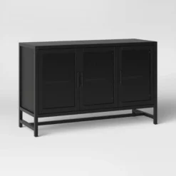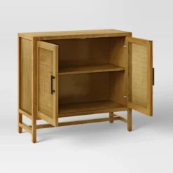 - Features open shelves and drawer